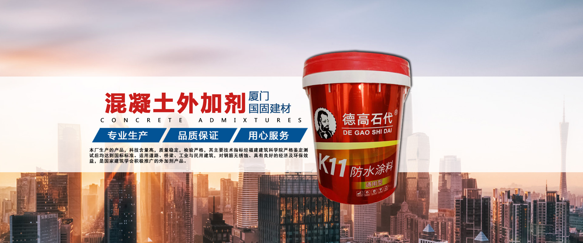 ??廈門國固建材有限公司是集科研開發,生產為一體的混凝土外加劑科技生產單位,公司技術力量雄厚,工藝科學先進,產品質量及性能在全國同行業中。并且有周到的售后服務,為您解除后顧之憂。本廠生產的產品,科技含量高,質量穩定,檢驗嚴格,其主要技術指標經福建建筑科學院嚴格鑒定測試后均達到國標標準。是目前水泥制品中理想的名加劑產品,適用道路、橋梁、工業與民用建筑,對鋼筋無繡蝕、具有良好的經濟及環保效益,是國家建筑學會積極推廣的外加劑產品。本廠推廣標準化,規范化、程序化管理、具有健全、完善、持續穩定運行的質量保證體系。產品遠銷上海、江蘇、浙江、廣州、北京、江西、安徽、福建等地,在大批國家建設工程中應用效果良好,并以性能優越、質量可靠、以及良好的售后服務在市場上享有很高的信譽。本廠在今后的歷程中,將一如既往的為您提供高質量、高科技的產品,完善的服務以感謝廣大客戶的支持和厚愛。“科技創新、以誠為本,用戶滿意”是我公司發展的永恒目標,我們堅持“以誠結情、質量取勝”,以高品質的產品回報社會。“用科興建材,創優品工程”,期待與各界朋友與時俱進,努力開拓進取,力求為用戶提供“高品質的產品,完善的服務”。公司愿與設計部門、建設單位、施工企業及同行們攜手合作,共創未來,共鑄輝煌、公司主要產品砂漿王、瓷磚膠,嵌縫劑、防水K11、高分子益膠泥、抗裂砂漿、界面劑、UEA膨脹劑等!